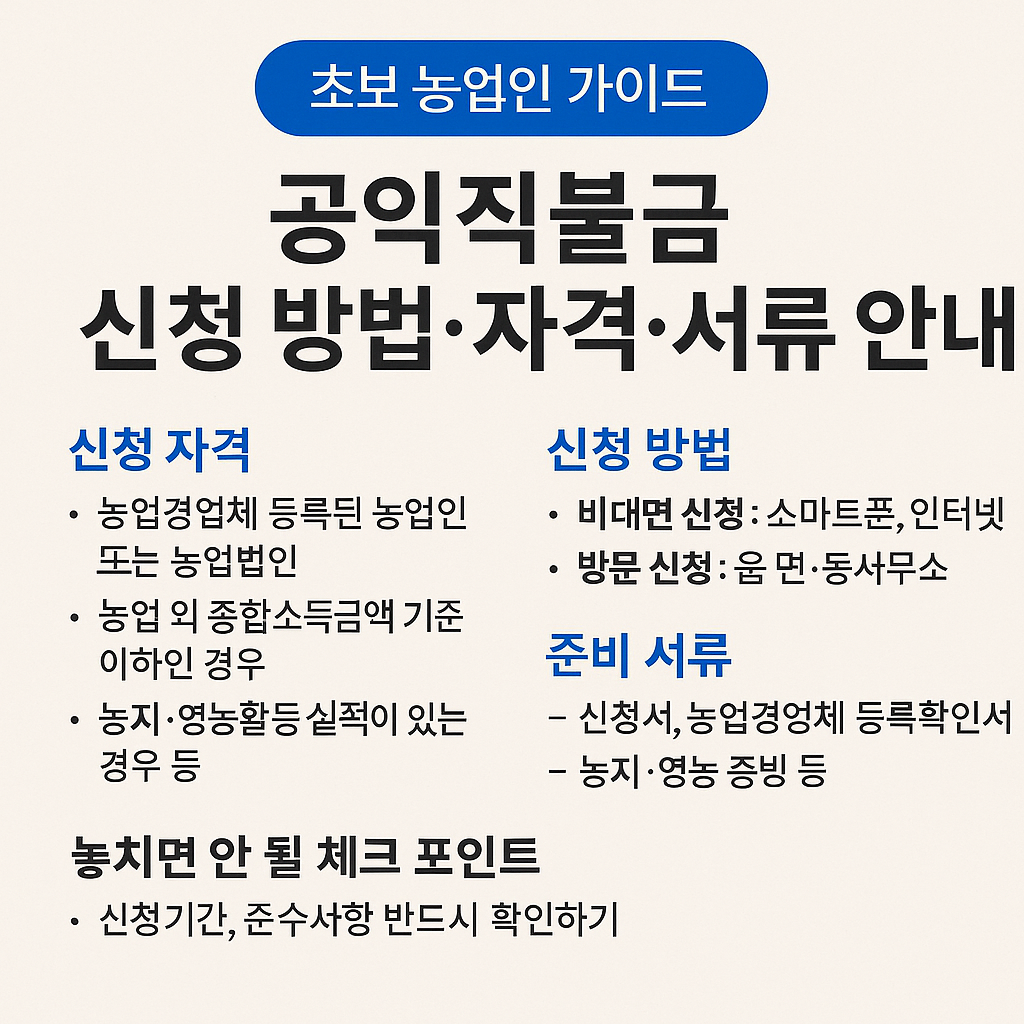 공익직불금(공익직불제)은 농업·농촌의 공익적 기능(환경보전, 안전한 먹거리, 농촌경관 유지 등)을 보상하는 제도입니다. 아래 가이드는 초보 농업인이 헷갈리기 쉬운 “자격요건·준비서류·신청 절차·준수사항”을 한 번에 정리해 유사문서와 차별화한 실전 체크리스트를 제공합니다.
